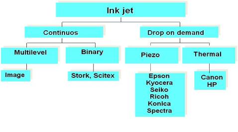噴墨技術(shù)分為連續(xù)噴墨和按需噴墨(DOD)兩種,前者目前只用在柯達(dá)的數(shù)字印刷機(jī)上,市場上的絕大部分噴墨打印機(jī)都屬于按需噴墨技術(shù),按需噴墨又分為壓電和熱發(fā)泡兩類,熱發(fā)泡噴頭廉價(jià)、精度高,但其缺點(diǎn)也是顯而易見的:噴頭壽命短、只適用水性墨水,因之主要用于家庭和辦公室的紙張打?。欢鴫弘妵娔抢锰沾杉由想妷汉髸冃蔚脑?,直接將電壓轉(zhuǎn)換為機(jī)械壓力,工作在常溫下,也無需溶解在水中的氧氣幫忙,所以不但噴頭壽命長,而且可以適用各種類型溶劑所生產(chǎn)的墨水。