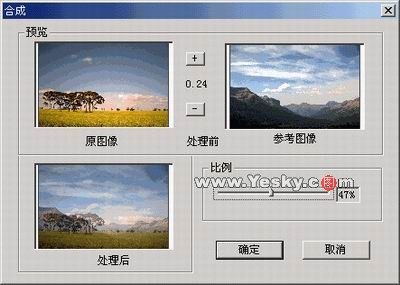 在“特效處理”中可給照片加入各種特殊效果,如圖片合成、美術(shù)效果、狀態(tài)效果、透視效果和將BMP圖象轉(zhuǎn)換為文本等,例如要將圖片合成,可打開兩幅照片,然后單擊“圖片合成”子菜單,將彈出合成預覽框。預覽框中提供了原圖象和參考合成圖象,以及合成后圖象的預覽,可通過調(diào)節(jié)滑桿來調(diào)節(jié)原圖象在合成后圖象中所占的比例,便捷好用。