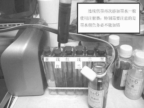 3.打印機使用連續(xù)供墨系統(tǒng)以后的日常保養(yǎng)工作不可忽視以下幾點:①打印機擺放位置不能被日光直接照射,同樣,外墨盒盡量不要長期被紫外線照射,以免外墨盒墨水保存時間縮短,如果受使用條件的限制,可以將外墨盒做遮光處理或者選用外墨盒有防紫外線盒子的連續(xù)供墨。②外墨盒上都有通氣孔,打印機的使用環(huán)境就需要注意防塵工作。③打印機不能長期不使用。噴頭在打印中是否有斷線,與氣候、環(huán)境、墨水質量、自身狀況等都有關系,最好每半個月至少使用1次,氣候特別干燥的地區(qū)每周至少使用1次,如確實無打印任務,可以打開打印機電源后,打印一張噴嘴檢查圖以便確定噴嘴狀況。④外墨盒再次添加墨水方法按照說明書操作即可,需要注意的是打印機外墨盒的墨水最好不要使用一點就馬上添加,墨水存放有一個保質期,每色使用到一定極限再添加為好;添加墨水的時候也要注意不要加得過滿,更不能添加錯顏色(圖14)。⑤不同牌子的墨水不要混用,如果要換其他牌子墨水,應將外墨盒中的墨水抽干后再更換,顏料墨水和染料墨水之間需要互換,應當先將整個連續(xù)供墨系統(tǒng)的墨水都抽干凈并進行清洗。