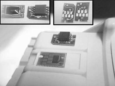 二是墨盒芯片對位不準確沒有被打印機檢測到。目前國內永久芯片沒有一個統(tǒng)一標準,比如芯片的體積大小和厚薄,當更換另一種芯片后,由于體積大小和厚薄的不一致,造成打印機無法檢測到芯片;還有一些內墨盒上芯片放置位置做工上的精確度不高,這樣就或多或少影響到芯片在墨盒上的固定點的精確度;當然墨盒標準尺寸不夠也會造成與打印機的彈簧接觸點對位不準,使打印機無法檢測到永久芯片(圖13)。