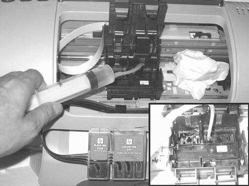 ②拔下軟管,將注射器和軟管清洗干凈,抽取清洗液或者純凈水后再次將軟管插入墨車上噴頭的吸墨柱,輕輕壓入2毫升水,水從墨車下流出,即刻用紙巾將水吸干(圖15)。如果感覺壓入的力量很輕,說明噴頭已通,如果感覺費力,再次輕輕壓入2毫升。最后,可以抽取1毫升相同顏色墨水壓入噴頭。