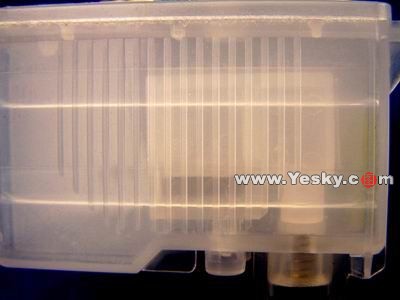 無海綿墨盒側(cè)面圖,里面有一個墨水壓力平衡倉,可以起到平衡墨水的作用,使得打印頭承受的壓力更為均衡。
