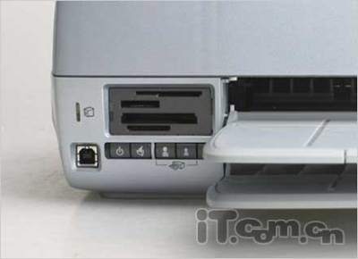 對(duì)于照片打印機(jī)來說,最重要就是它一般都設(shè)計(jì)內(nèi)置了數(shù)據(jù)讀卡單元,能夠在不連接計(jì)算機(jī)的情況下,可直接讀取數(shù)碼相機(jī)存儲(chǔ)卡中的照片數(shù)據(jù)并進(jìn)行打印??梢詮膱D中看到,在Photosmart 7268前面板上提供的一組存儲(chǔ)卡插槽,這一組存儲(chǔ)卡插槽,能夠直接讀取CompactFlash、SmartMedia、Secure Digital、多媒體卡以及記憶棒等主流類型的存儲(chǔ)介質(zhì)。另外在插槽旁邊也提供了提供了打印10×15cm照片和打印照片拼頁的按鍵,接讀取數(shù)碼相機(jī)存儲(chǔ)卡中的照片數(shù)據(jù)并進(jìn)行打印。